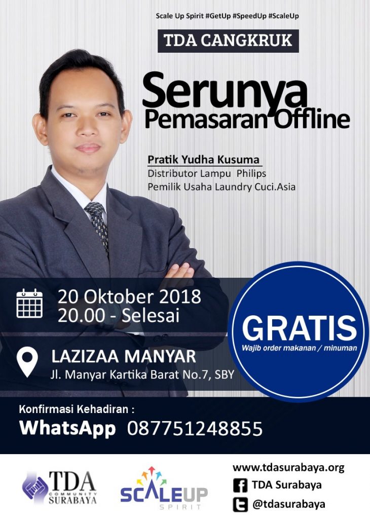 ” TDA Cangkruk “ ” Serunya Pemasaran Offline “ By : Pratik Yudha Kusuma Komunitas Tangan Diatas (TDA) adalah sebuah komunitas wirausaha terbesar di Indonesia. Hadir di 5 negara, 15 wilayah dan 61 daerah termasuk di Surabaya. TDA Surabaya secara rutin mengadakan beragam kegiatan bisnis, baik teknis maupun non teknis guna mengembangkan kapasitas bisnis anggotanya. […]