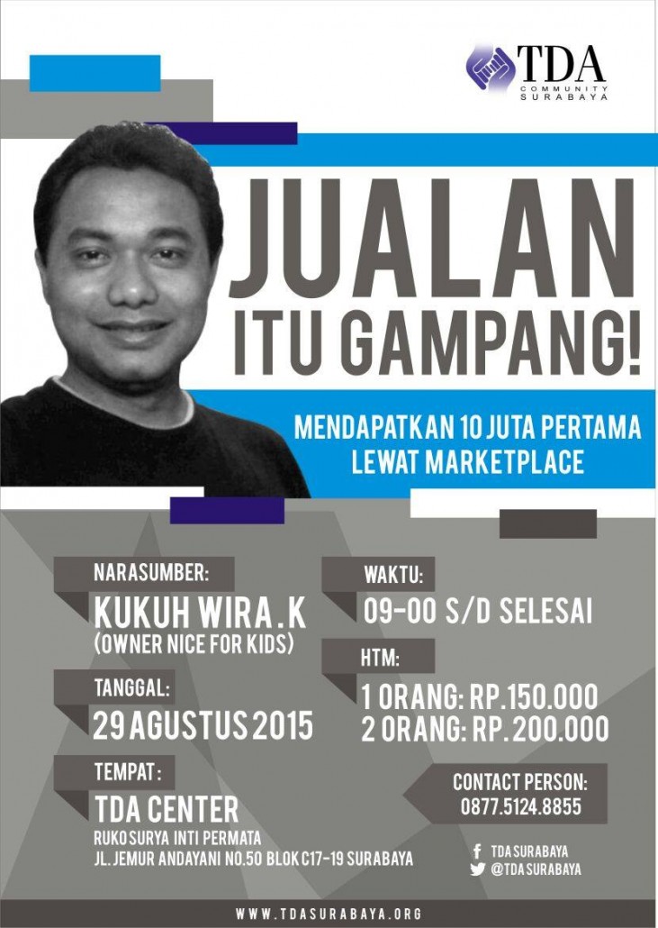 Tindak lanjut dari TDA Cangkruk, kali ini praktek bareng di workshop 1 hari penuh di TDA Class. Bagaiman secara real memperoleh 10 juta pertama dari jualan online di marketplace