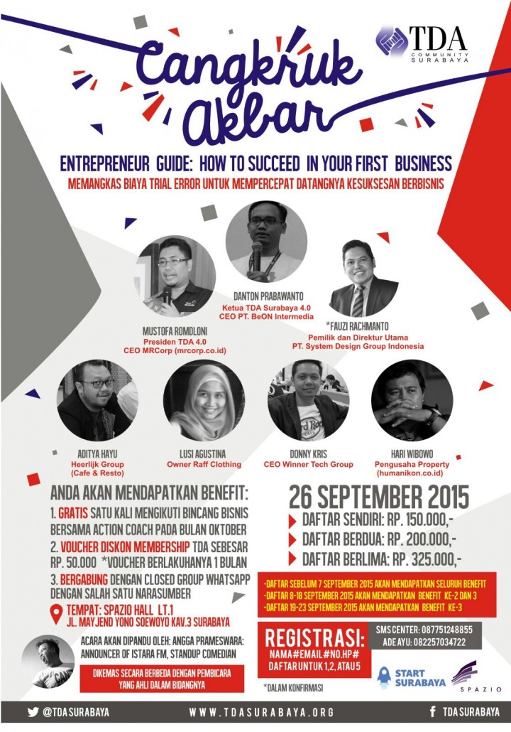 TDA Cangkruk Akbar, ya AKBAR karena 250 orang akan hadir di sesi sharing bagaimana narasumber akan share bagaimana mengembangkan bisnis pertama mereka. Sehingga peserta bisa menjadi salah satu yang keluar dari jerat 9/10 orang yang gagal di tahun pertama bisnis.